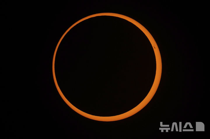 [이스터섬=AP/뉴시스] 2일(현지시각) 칠레 이스터섬의 타하이 상공에서 달이 태양 앞을 지나며 가장자리 부분이 금반지 모양으로 보이는 '금환일식'이 관측되고 있다. 2024.10.03.