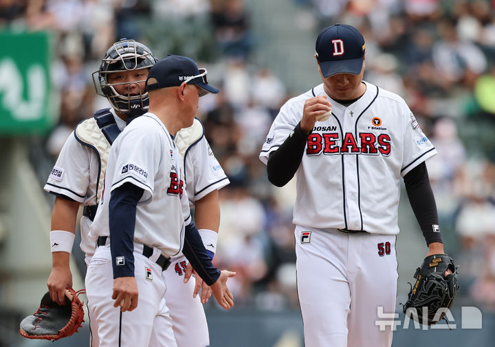 [서울=뉴시스] 김근수 기자 = 3일 서울 송파구 잠실야구장에서 열린 2024 KBO리그 와일드카드 2차전 kt 위즈와 두산 베어스의 경기, 5회초 2사 주자 만루상황에서 두산 두번째 투수 이영하가 마운드를 내려가고 있다. 2024.10.03. [email protected]
