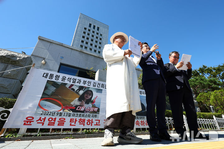 [서울=뉴시스] 전신 기자 = 4일 서울 서초구 대검찰청 앞에서 백은종(왼쪽부터) 서울의소리 대표와 최재영 목사, 사업가 정대택씨가 '대통령 부부에 대한 청탁금지법위반 등 고발사건' 관련 피고발인 5명에 대해 불기소 처분한 검찰을 규탄하는 기자회견을 하고 있다. 2024.10.04. [email protected]