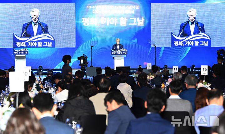 [수원=뉴시스] 김종택 기자 = 문재인 전 대통령이 4일 경기도 수원시 영통구 수원컨벤션센터에서 열린 10.4 남북정상선언 17주년 기념식에 참석해 기조연설을 하고 있다. 2024.10.04. [email protected]