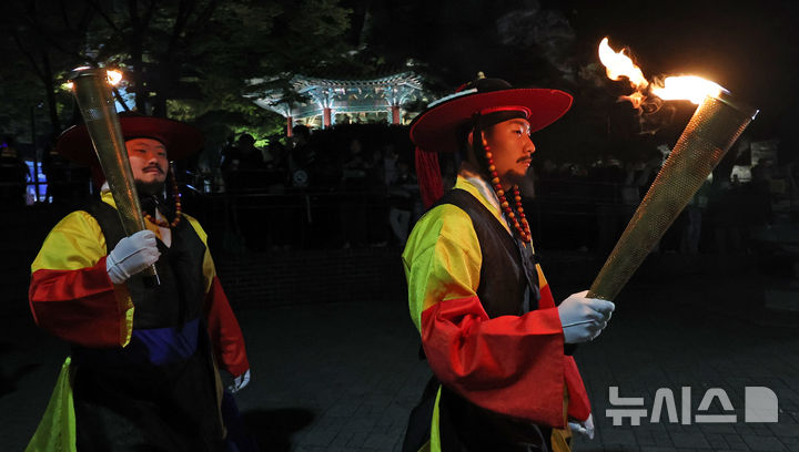 [서울=뉴시스] 김금보 기자 = 4일 서울 중구 남산 봉수대에서 열린 '제32회 남산봉화식'에서 봉수군들이 봉화를 올리기 위해 이동하고 있다. 2024.10.04. [email protected]
