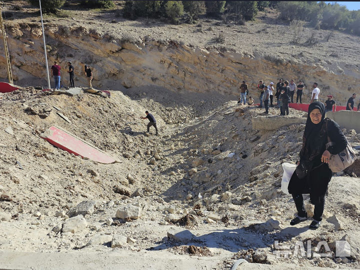 [베카밸리=AP/뉴시스] 4일(현지시각) 시리아 피란민들이 레바논 베카밸리 동부 마스나 국경에서 이스라엘의 공습으로 생겨난 포탄 구덩이를 지나 시리아로 걸어 들어가고 있다. 이스라엘군은 레바논과 시리아 검문소 사이 도로를 차단하기 위해 이곳을 공습했다. 2024.10.05.