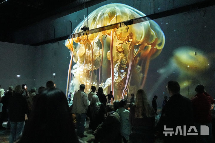 [도르트문트=AP/뉴시스] 4일(현지시각) 독일 도르트문트에서 열린 '피닉스 데 뤼미에르'(Phoenix des Lumieres) 전시회 관람객들이 옛 철강 공장 벽에 투영된 시청각 전시 '오션 오디세이'를 감상하고 있다. '오션 오디세이'는 바다의 아름다움과 신비를 주제로 한 몰입형 시청각 전시로 해양 생태계의 다양한 장면을 거대한 규모로 투영해, 방문객들이 바닷속을 탐험하는 느낌을 받게 한다. 2024.10.05.