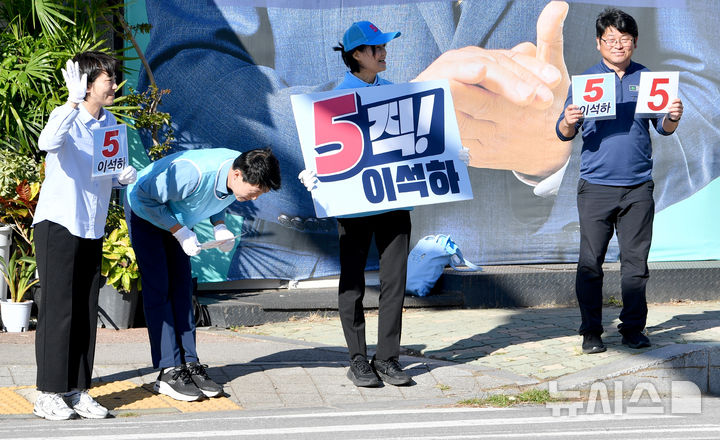 [영광=뉴시스] 변재훈 기자 = 10·16 전남 영광군수 재선거를 열흘여 앞둔 5일 오후 영광군 영광읍 터미널 시장 앞 도로변에서 진보당 이석하 후보 선거운동원들이 유권자들에게 지지를 호소하고 있다. 2024.10.05. [email protected]