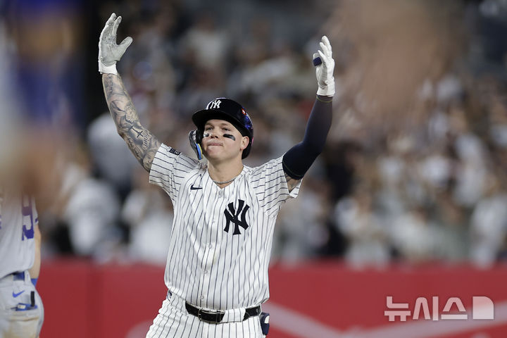 [뉴욕=AP/뉴시스] 뉴욕 양키스의 알렉스 버두고가 5일(현지시각) 미국 뉴욕의 양키 스타디움에서 열린 2024 메이저리그 아메리칸리그 디비전시리즈(ALDS·5전3선승) 1차전 캔자스시티 로열스와 경기 7회 말 역전 1타점 2루타를 치고 나가 세리머니하고 있다. 양키스는 버두고의 결승타로 6-5 승리를 거뒀다. 2024.10.06.