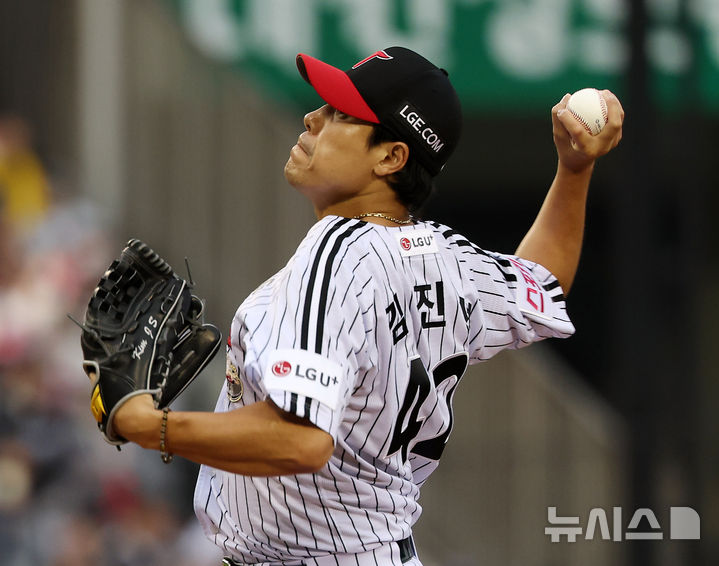 [서울=뉴시스] 김명년 기자 = 6일 오후 서울 송파구 잠실야구장에서 열린 2024 프로야구 준플레이오프 2차전 kt 위즈와 LG 트윈스의 경기, 8회초 LG 김진성이 공을 던지고 있다. 2024.10.06. [email protected]