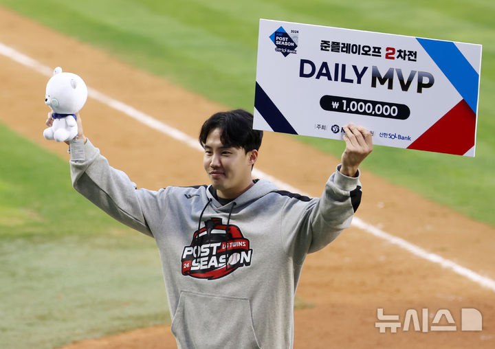 [서울=뉴시스] 이영환 기자 = 6일 오후 서울 송파구 잠실야구장에서 열린 2024 프로야구 준플레이오프 2차전 kt 위즈와 LG 트윈스의 경기 데일리 MVP를 차지한 LG 임찬규가 포즈를 취하고 있다.  2024.10.06. [email protected]