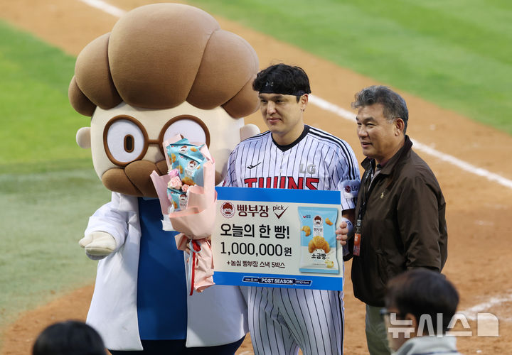 [서울=뉴시스] 이영환 기자 = 6일 오후 서울 송파구 잠실야구장에서 열린 2024 프로야구 준플레이오프 2차전 kt 위즈와 LG 트윈스의 경기, 빵부장 픽에 선정된 LG 박동원이 포즈를 취하고 있다. 2024.10.06. [email protected]