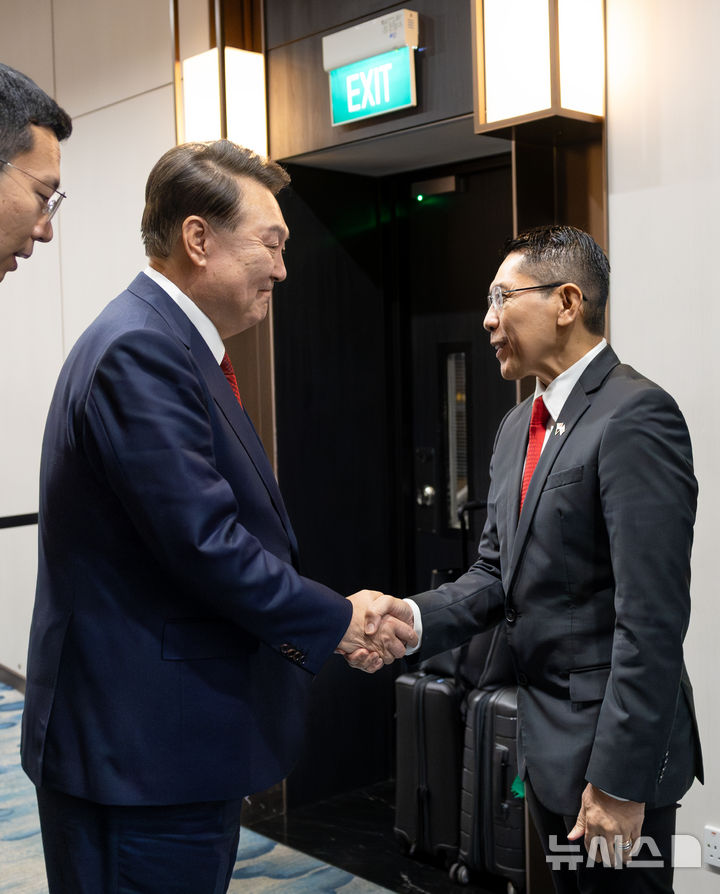 [싱가포르=뉴시스] 최진석 기자 = 싱가포르를 국빈 방문한 윤석열 대통령이 7일(현지시각) 오후 창이국제공항공항에 도착해 영예수행장관과 인사를 나누고 있다. (공동취재) 2024.10.07. [email protected]