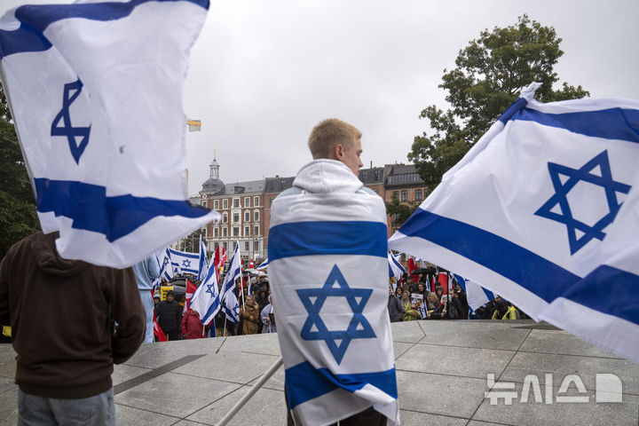 [코펜하겐=AP/뉴시스] 7일(현지시각) 덴마크 코펜하겐의 이스라엘 광장에서 이스라엘-가자지구 전쟁 발발 1주년을 맞아 시위대가 이스라엘 국기를 흔들며 시위하고 있다. 2024.10.08.
