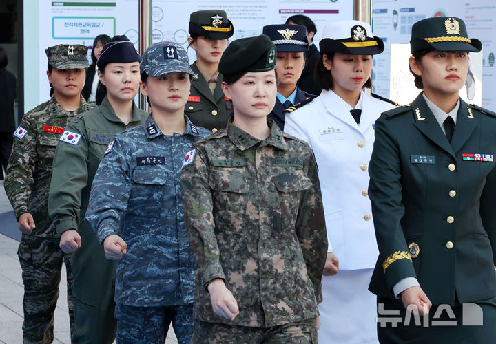 [서울=뉴시스] 홍효식 기자 = 8일 오후 서울 강남구 코엑스 밀레니엄 광장에서 열린 제대군인 주간 개막 행사에서 제대군인들이 육·해·공군·해병대의 정복과 전투복을 착용하고 교대식을 하기 위해 이동하고 있다. 2024.10.08. [email protected]