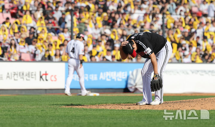 [수원=뉴시스] 김금보 기자 = 9일 경기도 수원케이티위즈파크에서 열린 2024 KBO 포스트시즌 준플레이오프 4차전 LG 트윈스와 kt 위즈의 경기, 4회말 2사 2,3루 LG 김진성이 역전 적시타에 이어 볼넷을 내주고 아쉬워하고 있다. 2024.10.09. [email protected]