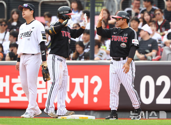 [수원=뉴시스] 황준선 기자 = 9일 경기도 수원케이티위즈파크에서 열린 2024 KBO 포스트시즌 준플레이오프 4차전 LG 트윈스와 kt 위즈의 경기, 4회초 2사 3루 상황 LG 문성주가 1타점 적시타를 친 뒤 코치와 하이파이브 하고 있다. 2024.10.09. [email protected]