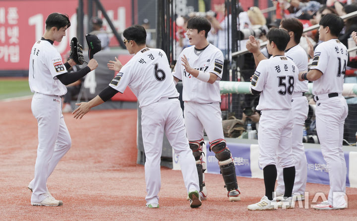 [수원=뉴시스] 최동준 기자 = 9일 경기도 수원케이티위즈파크에서 열린 2024 KBO 포스트시즌 준플레이오프 4차전 LG 트윈스와 kt 위즈의 경기에서 8회 kt 고영표가 교체되며 동료들과 하이파이브하고 있다. 2024.10.09. photocdj@newsis.com