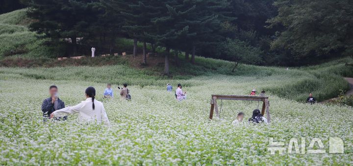 [청주=뉴시스] 서주영 기자 = 10일 오후 충북 청주시 상당구 낭성면 추정리의 메밀꽃밭을 찾은 시민들이 지면을 하얗게 수놓은 메밀꽃 길을 거닐며 가을을 만끽하고 있다. 2024.10.10. [email protected]