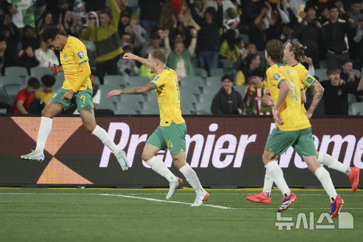 [애들레이드=AP/뉴시스] 호주(25위)의 니샨 벨루필레이(왼쪽)가 10일(현지시각) 호주 애들레이드의 애들레이드 오벌 경기장에서 열린 2026 국제축구연맹(FIFA) 북중미월드컵 아시아지역 3차 예선 C조 3차전 중국(91위)과 경기 후반 추가시간 쐐기 골을 넣은 후 환호하고 있다. 호주가 중국에 3-1 역전승을 거두며 승점 3점을 챙겼다. 2024.10.10.