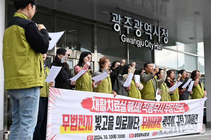 [광주=뉴시스] 이영주 기자 = 전국보건노조 광주시립제1요양병원지부가 10일 오전 광주 서구 광주시청 앞에서 기자회견을 열어 광주시립제1요양병원을 위탁운영하고 있는 빛고을 의료재단을 향해 중앙노동위원회의 부당 전보 판결을 받아들이고 원직 복귀 등 후속 대책을 이행할 것을 촉구하고 있다. 2024.10.10. [email protected]