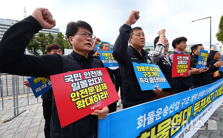 [서울=뉴시스] 김근수 기자 = 전국민주노동조합총연맹 공공운수노조 화물연대 조합원들이 10일 서울 용산구 대통령실 인근에서 화물연대 투쟁선포 기자회견에서 피켓을 들고 구호를 외치고 있다. 2024.10.10. [email protected]