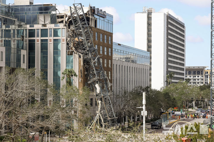 밀턴 여파로 맞은편 건물에 쓰러진 대형 크레인