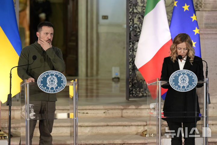 [로마=AP/뉴시스] 볼로디미르 젤렌스키(왼쪽) 우크라이나 대통령이 10일(현지시각) 이탈리아 로마의 빌라 팜필리에서 조르자 멜로니 이탈리아 총리와 공동 기자회견하고 있다. 2024.10.11.