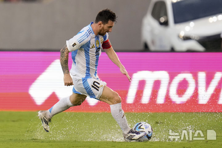 [마투린=AP/뉴시스] 아르헨티나(1위)의 리오넬 메시가 10일(현지시각) 베네수엘라 마투린의 모누멘탈 데 마투린 경기장에서 열린 2026 국제축구연맹(FIFA) 북중미월드컵 남미예선 9차전 베네수엘라(40위)와 경기 중 공을 몰고 있다. 메시는 풀타임을 소화했고 1-1로 비긴 아르헨티나는 6승1무2패(승점 19)로 선두를 유지하고 있다. 2024.10.11.