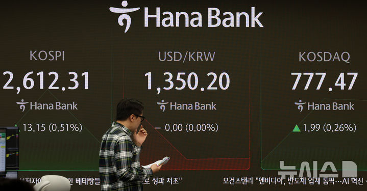 [서울=뉴시스] 이영환 기자 = 코스피가 전 거래일(2599.16)보다 12.86포인트(0.49%) 오른 2612.02에 개장한 11일 오전 서울 중구 하나은행 딜링룸 전광판에 지수가 표시되고 있다.