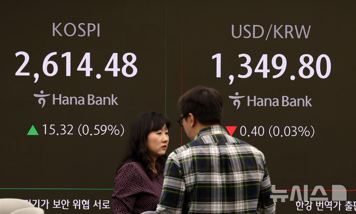 [서울=뉴시스] 이영환 기자 = 코스피가 전 거래일(2599.16)보다 12.86포인트(0.49%) 오른 2612.02에 개장한 11일 오전 서울 중구 하나은행 딜링룸 전광판에 지수가 표시되고 있다.