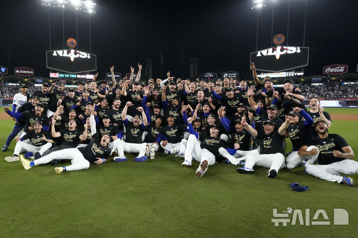 [로스앤젤레스=AP/뉴시스] LA 다저스 선수들이 11일(현지시각) 미 캘리포니아주 로스앤젤레스의 다저 스타디움에서 열린 2024 메이저리그 내셔널리그 디비전시리즈(NLDS·5전3선승) 5차전에서 샌디에이고 파드리스를 2-0으로 물리친 후 기념 촬영하고 있다. 오타니 쇼헤이가 침묵한 다저스는 1점 홈런 두 방으로 샌디에이고를 2-0으로 꺾고 내셔널리그 챔피언십시리즈(NLCS·7전4선승)에 진출했다. 2024.10.12.