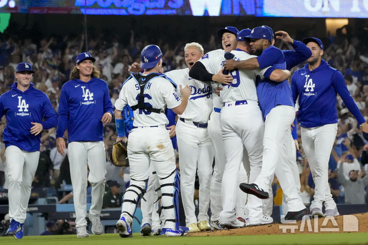[로스앤젤레스=AP/뉴시스] LA 다저스 선수들이 11일(현지시각) 미 캘리포니아주 로스앤젤레스의 다저 스타디움에서 열린 2024 메이저리그 내셔널리그 디비전시리즈(NLDS·5전3선승) 5차전에서 샌디에이고 파드리스를 2-0으로 물리친 후 마운드에 모여 환호하고 있다. 오타니 쇼헤이가 침묵한 다저스는 1점 홈런 두 방으로 샌디에이고를 2-0으로 꺾고 내셔널리그 챔피언십시리즈(NLCS·7전4선승)에 진출했다. 2024.10.12.