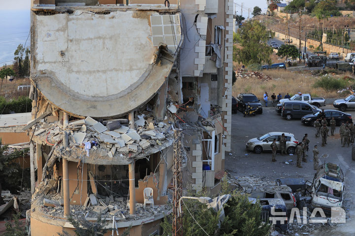 [베이루트=AP/뉴시스] 12일(현지시각) 레바논 베이루트 남부 바르자 마을에서 이스라엘 공습으로 파괴된 건물 주변에 레바논 군인들이 배치돼 있다. 2024.10.13.