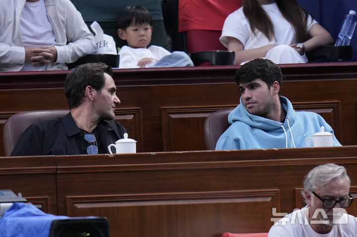 [상하이=AP/뉴시스] 테니스 전설 로저 페더러(스위스, 왼쪽)가 카를로스 알카라스(2위·스페인)와 함께 13일(현지시각) 중국 상하이에서 열린 남자프로테니스(ATP) 투어 롤렉스 상하이 마스터스 남자 단식 결승전 얀니크 신네르(1위·이탈리아)와 노바크 조코비치(4위·세르비아)의 경기를 관람하며 얘기를 나누고 있다. 신네르가 조코비치를 2-0(7-6 6-3)으로 꺾고 정상에 올랐다. 2024.10.13.