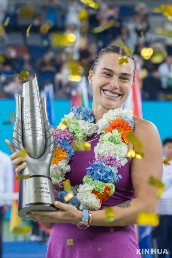 [우한=신화/뉴시스] 아리나 사발렌카(2위·벨라루스)가 13일(현지시각) 중국 후베이성 우한에서 열린 여자프로테니스(WTA) 투어 2024 우한 오픈 여자 단식 정상에 올라 트로피를 들고 활짝 웃고 있다. 사발렌카는 결승전에서 정친원(7위·중국)을 2-1(6-3 6-7 6-3)로 꺾고 이번 시즌 4번째 우승, 이 대회 3연패를 달성했다. 2024.10.14.