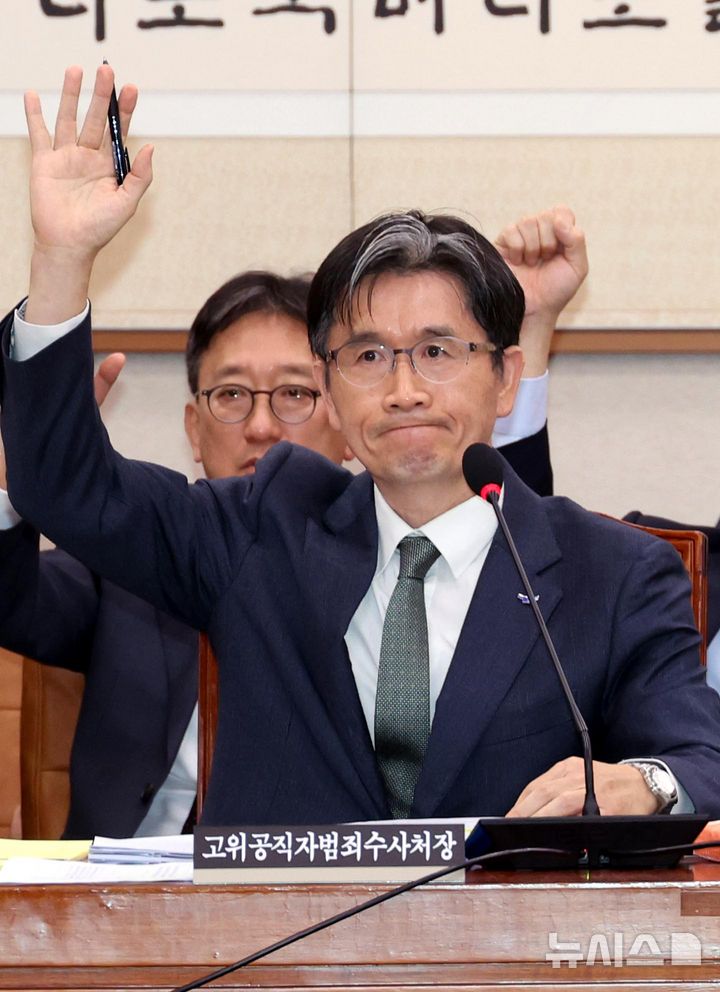 [서울=뉴시스] 조성봉 기자 = 오동운 고위공직자범죄수사처장을 비롯한 관계자들이 14일 오후 서울 여의도 국회 법제사법위원회에서 열린 공수처에 대한 국정감사에서 곽규택 국민의힘 의원의 '공수처가 존속되어야한다고 생각하는 분은 손을 들어달라'는 질문에 손을 들고 있다. 2024.10.14. [email protected]