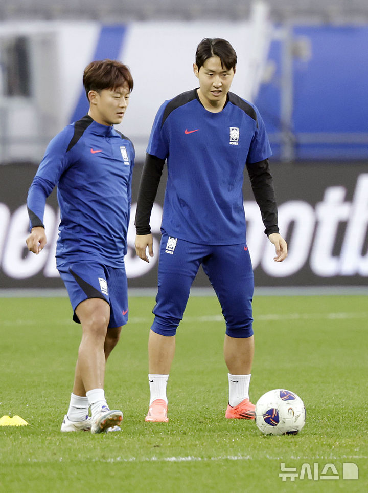 [용인=뉴시스] 최동준 기자 = 축구 국가대표팀 이승우, 이강인, 설영우 등이 2026 북중미월드컵 아시아 지역 3차 예선 B조 4차전 이라크와 경기를 하루 앞둔 14일 용인미르스타디움에서 훈련하고 있다. 2024.10.14. [email protected]