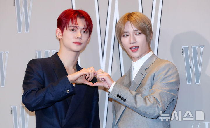 [서울=뉴시스] 김혜진 기자 = 그룹 투모로우바이투게더 연준(왼쪽), 범규가 14일 오후 서울 종로구 포시즌스호텔에서 열린 더블유 코리아 제19회 유방암 인식 향상 캠페인 자선 행사 'LOVR YOUR W'에서 포즈를 취하고 있다. 2024.10.14. [email protected]