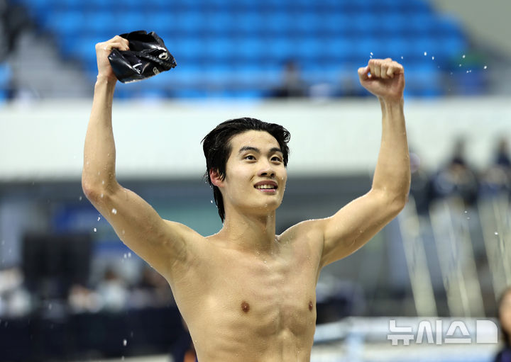 [창원=뉴시스] 김명년 기자 = 14일 오후 경남 창원시 창원실내수영장에서 열린 제105회 전국체육대회 수영 남자 일반부 자유형 200m 결승에서 1위로 경기를 마친 황선우가 관중에게 인사하고 있다. 2024.10.14. [email protected]