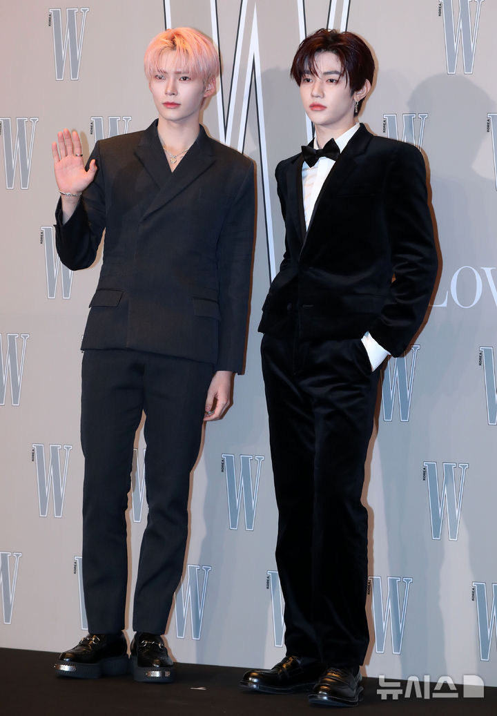 [서울=뉴시스] 김혜진 기자 = 그룹 제로베이스원 성한빈(왼쪽), 장하오가 14일 오후 서울 종로구 포시즌스호텔에서 열린 더블유 코리아 제19회 유방암 인식 향상 캠페인 자선 행사 'LOVR YOUR W'에서 포즈를 취하고 있다. 2024.10.14. [email protected]
