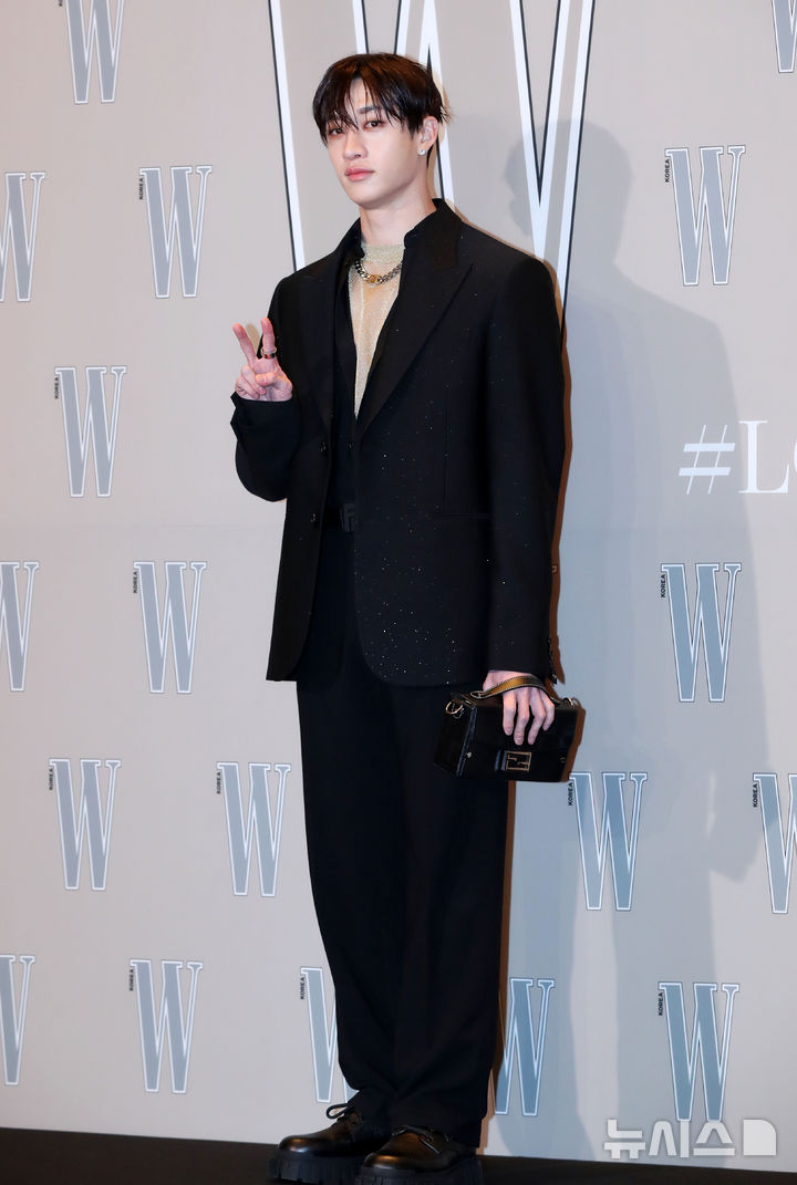 [서울=뉴시스] 김혜진 기자 = 그룹 스트레이키즈 방찬이 14일 오후 서울 종로구 포시즌스호텔에서 열린 더블유 코리아 제19회 유방암 인식 향상 캠페인 자선 행사 'LOVR YOUR W'에서 포즈를 취하고 있다. 2024.10.14. [email protected]