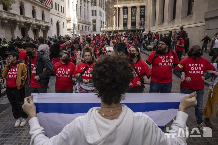 [뉴욕=AP/뉴시스] 14일(현지시각) 미국 뉴욕의 증권거래소 밖에서 이스라엘-하마스 전쟁 반대 시위대가 시위하는 동안 이스라엘을 지지하는 한 남성이 이스라엘 국기를 들고 이들과 대치하고 있다. 2024.10.15.