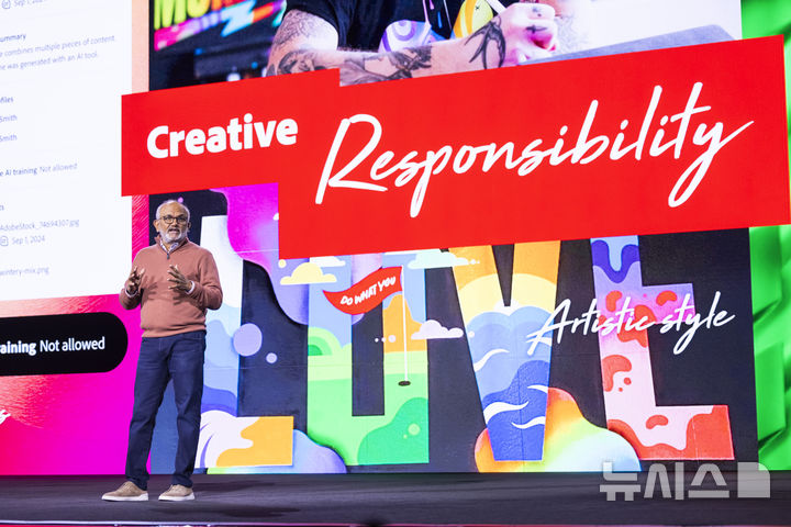 [마이애미=AP/뉴시스] 샨타누 나라옌 어도비 최고경영자(CEO)가 14일(현지시각) 미 플로리다 마이애미에서 열린 '어도비 맥스 2024'에서 연설하고 있다. 어도비는 ‘어도비 맥스 2024’에서 동영상 AI 모델인 '파이어플라이 비디오 모델'을 공개했다. 2024.10.15.
