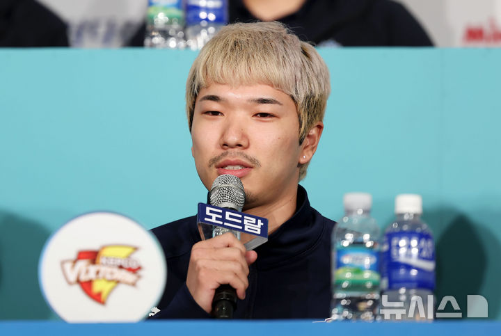[서울=뉴시스] 홍효식 기자 = 15일 서울 서초구 더케이호텔서울에서 열린 도드람 2024~2025 V-리그 남자부 미디어데이에서 한국전력 야마토 나카노 선수가 대답하고 있다. 2024.10.15. [email protected]