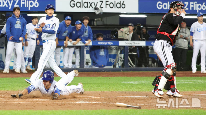 [대구=뉴시스] 이무열 기자 = 15일 오후 대구 수성구 삼성라이온즈파크에서 열린 2024 KBO 포스트시즌 플레이오프 2차전 LG 트윈스와 삼성 라이온즈의 경기, 3회말 2사 주자 1루 상황에서 삼성 디아즈 안타 때 2루 주자 이성규가 우익수 송구실책으로 홈으로 득점하고 있다. 2024.10.15. [email protected]