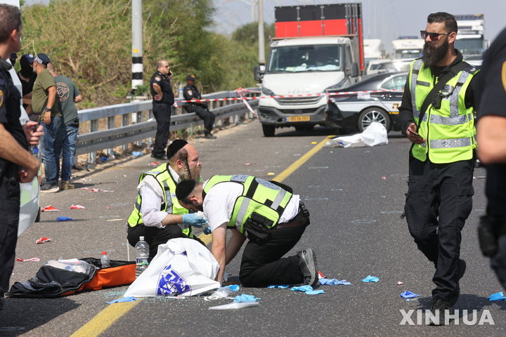 [야브네=신화/뉴시스] 15일(현지시각) 이스라엘 남부 야브네 교차로 인근 총격 현장에서 응급구조단체 자카(ZAKA) 자원봉사자와 이스라엘 보안군이 희생자 시신을 수습하고 있다. 현지 경찰은 서안지구에서 불법 입국한 20대 남성이 고속도로에서 총격을 벌여 이스라엘 경관 1명이 숨지고 민간인 3명이 다쳤다고 밝혔다. 2024.10.16.