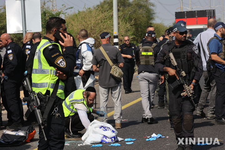 [야브네=신화/뉴시스] 15일(현지시각) 이스라엘 남부 야브네 교차로 인근 총격 현장에 응급구조단체 자카(ZAKA) 자원봉사자와 이스라엘 보안군이 모여 있다. 현지 경찰은 서안지구에서 불법 입국한 20대 남성이 고속도로에서 총격을 벌여 이스라엘 경관 1명이 숨지고 민간인 3명이 다쳤다고 밝혔다. 2024.10.16.