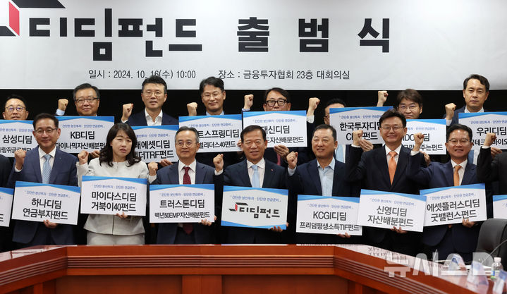 [서울=뉴시스] 홍효식 기자 = 서유석 금융투자협회 회장이 16일 서울 영등포구 금융투자협회에서 열린 디딤펀드 출범식에서 25개 자산운용사 대표이사 등 참석자들과 기념촬영하고 있다. 2024.10.16. [email protected]