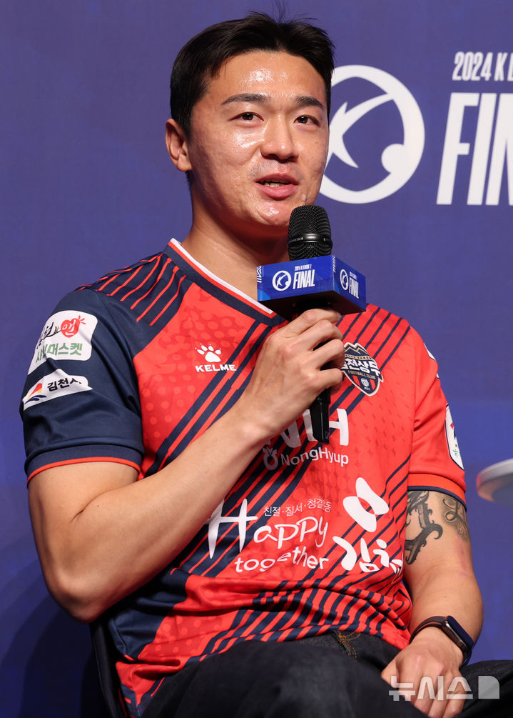 [서울=뉴시스] 이영환 기자 = 김천상무 김민덕이 16일 오후 서울 마포구 누리꿈스퀘어 국제회의실에서 열린 K리그1 2024 파이널라운드 미디어데이에서 출사표를 던지고 있다. 2024.10.16. [email protected]