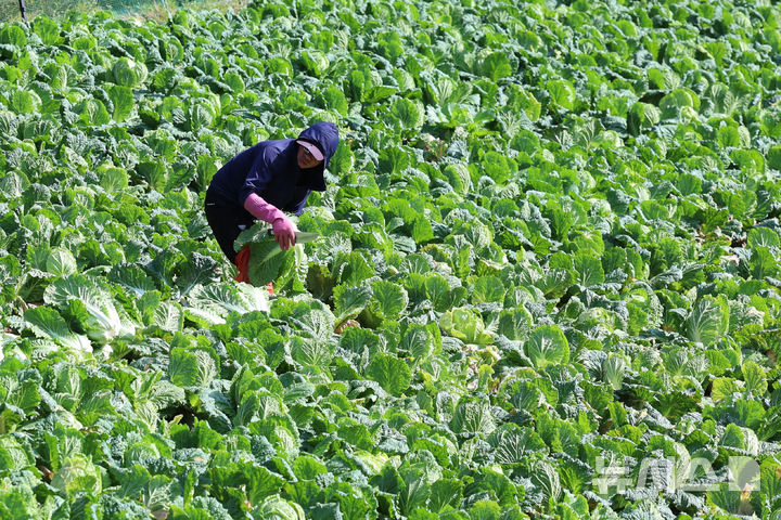 [평창=뉴시스] 권창회 기자 = 17일 오후 강원 평창군 방림면 일대 배추농가에서 농민들이 배추 출하작업을 하고 있다. 가격조사기관 한국물가협회는 배추 수급 동향과 지난 20년간의 생활물가 조사 자료를 분석한 결과 11월 배추 소매가격이 포기당 평균 5300원 수준이 될 것으로 보인다고 밝혔다.2024.10.17. [email protected]