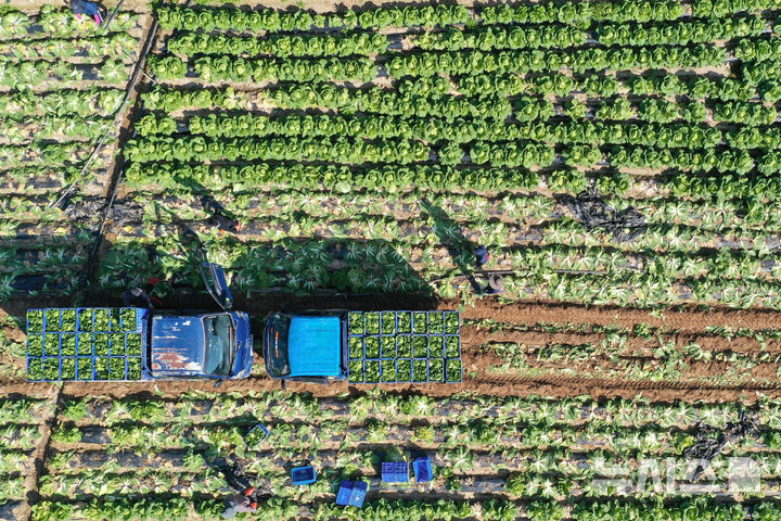 [평창=뉴시스] 권창회 기자 = 17일 오후 강원 평창군 방림면 일대 배추농가에서 농민들이 배추 출하작업을 하고 있다.