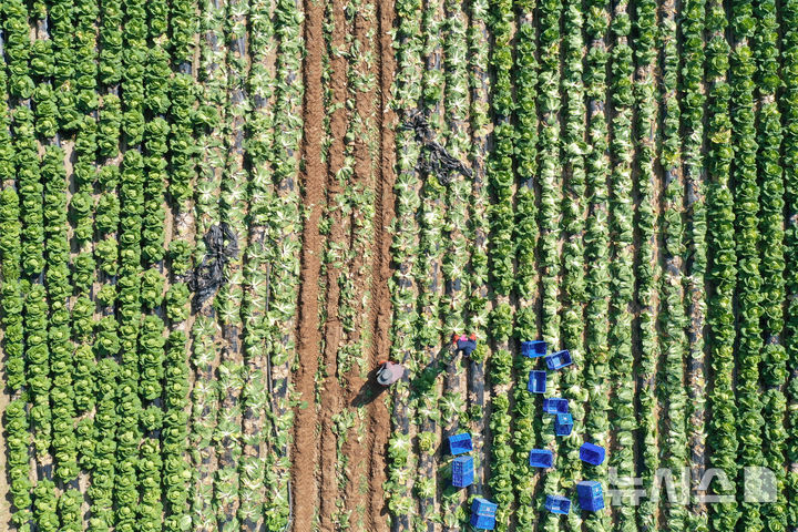 [평창=뉴시스] 권창회 기자 = 17일 오후 강원 평창군 방림면 일대 배추농가에서 농민들이 배추 출하작업을 하고 있다. 가격조사기관 한국물가협회는 배추 수급 동향과 지난 20년간의 생활물가 조사 자료를 분석한 결과 11월 배추 소매가격이 포기당 평균 5300원 수준이 될 것으로 보인다고 밝혔다. 2024.10.17. [email protected]