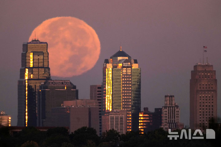 [캔자스시티=AP/뉴시스] 17일(현지시각) 미 미주리주 캔자스시티 시내 고층 건물 사이로 슈퍼문이 떠오르고 있다. 10월의 보름달은 환한 달빛 덕분에 사냥꾼들이 늦은 저녁까지 사냥할 수 있다고 해서 '사냥꾼의 달'(Hunter's Moon)이라고 부르기도 한다. 2024.10.18.